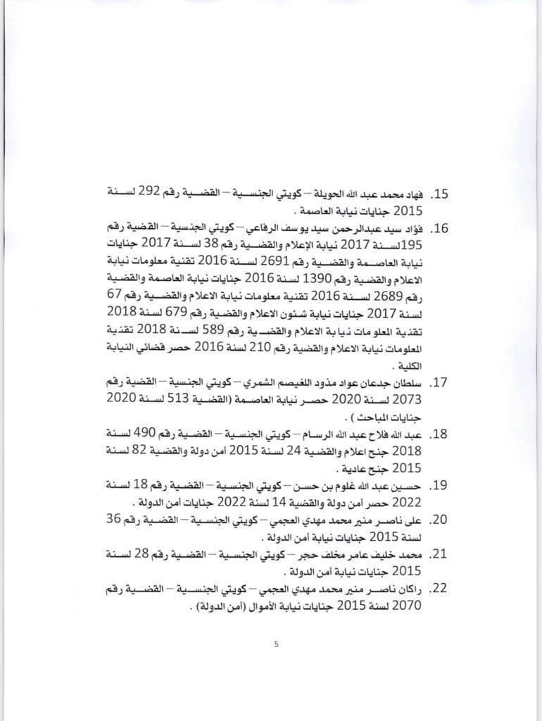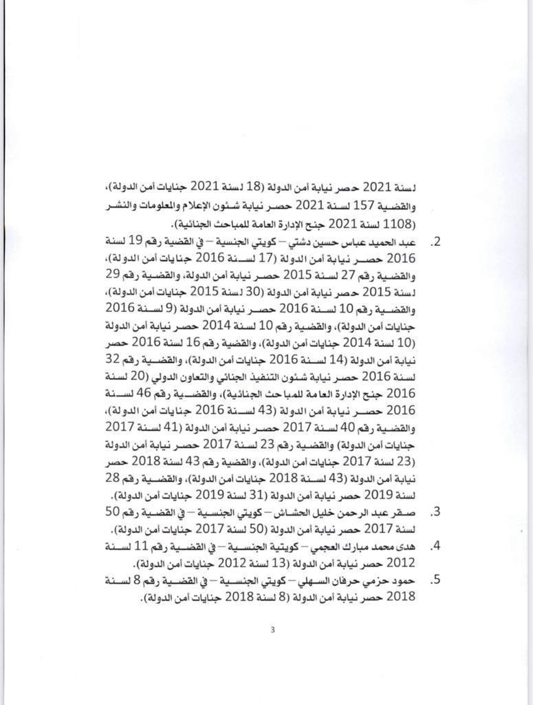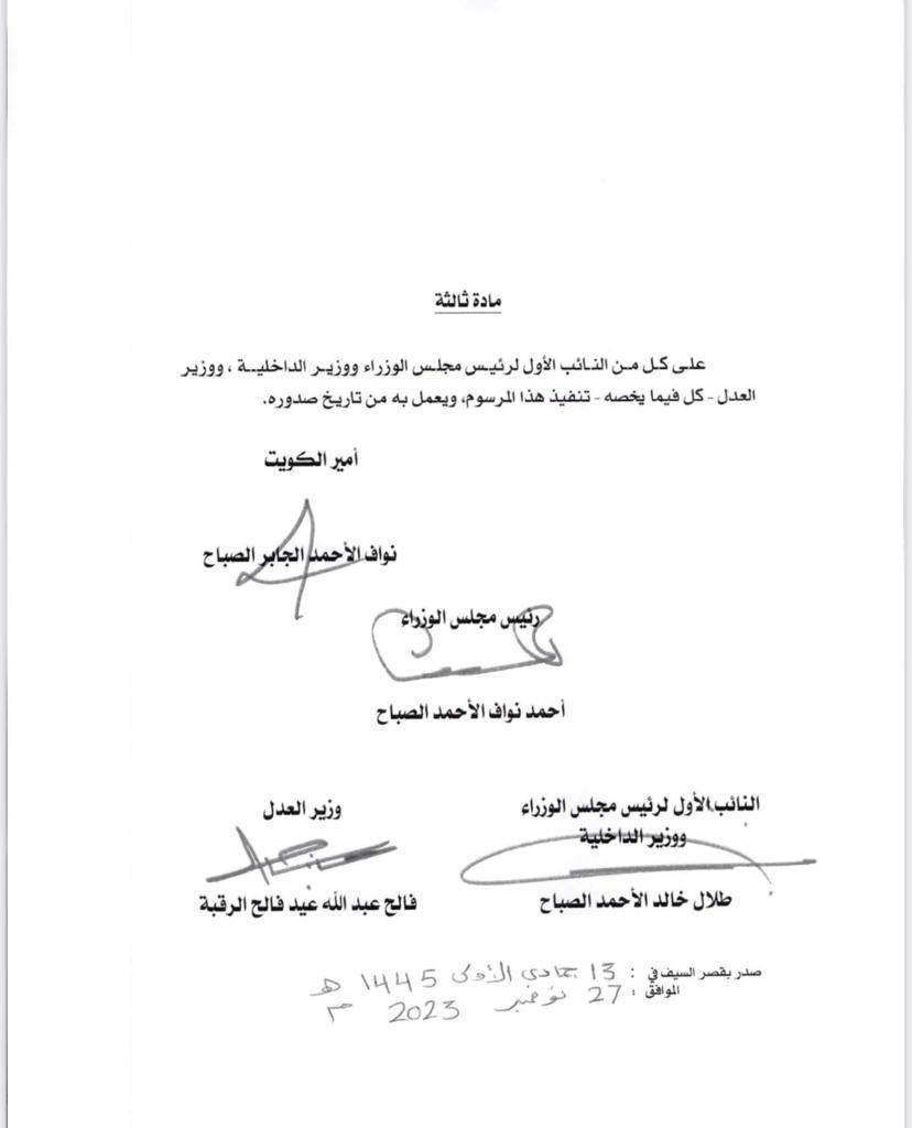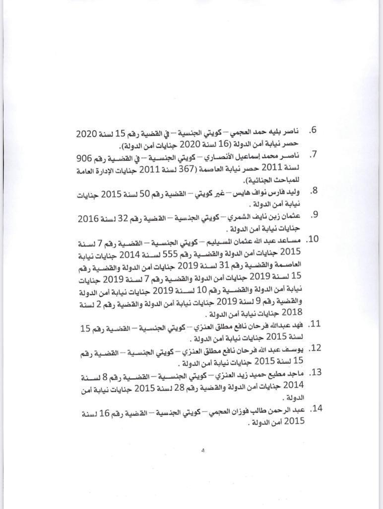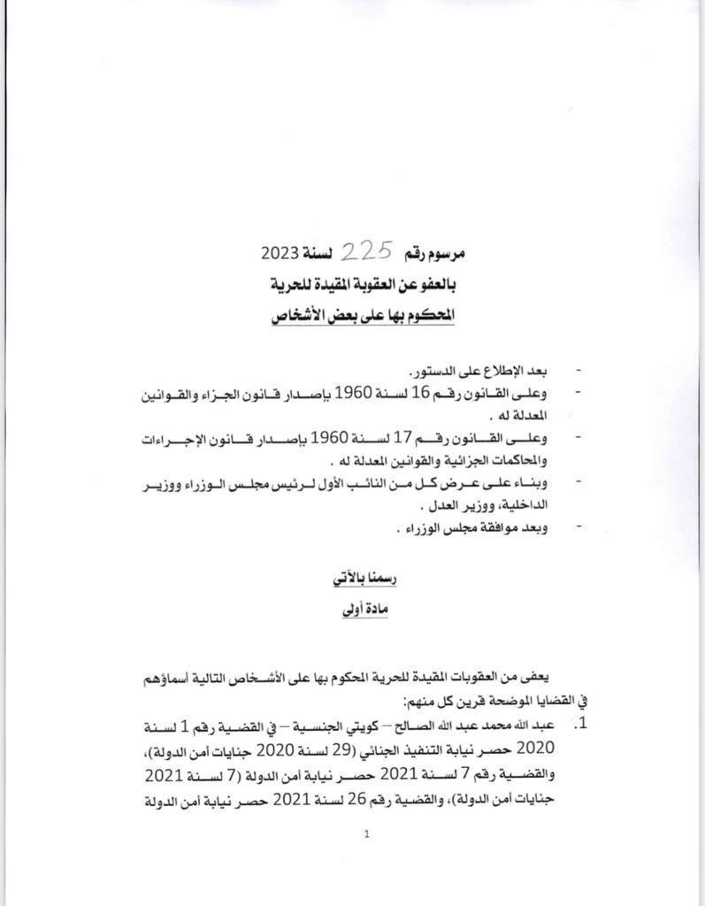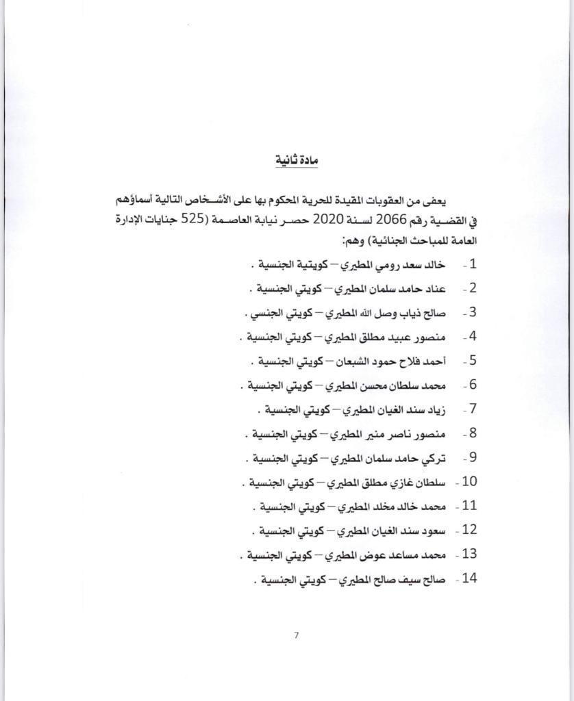 أعلن مركز التواصل الحكومي أسماء المشمولين بالعفو عن العقوبة المقيدة للحرية المحكوم بها على بعض الأشخاص. وكان مجلس الوزراء أعلن انه أحيط علما في مستهل اجتماعه بتوجيهات صاحب السمو الأمير الشيخ نواف الأحمد بشأن العفو عن بعض المواطنين ممن صدرت بحقهم أحكام، وذلك على النحو الذي تقدره الإرادة الأميرية السامية بما لها من رؤية أبوية حكيمة. وتنفيذا للتوجيهات السامية، فقد وافق على مشروع مرسوم بالعفو عن العقوبة المقيدة للحرية المحكوم بها على بعض الأشخاص ورفعه الى صاحب السمو. وفيما يلي أسماء المشمولين بالعفو:
